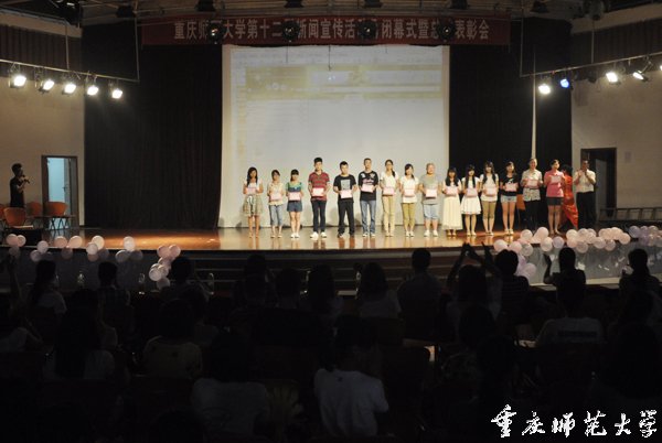 “第十二屆新聞宣傳活動月”紀錄片中大家忙碌的身影和燦爛的笑臉,讓活動月中的美好瞬間依然歷歷在目。隨后,劉清泉副部長總結新聞宣傳活動月期間各項活動所取得成果。他指出,本屆新聞宣傳活動月力求實效,全員參與;形式新穎,內(nèi)容豐富。不僅提升了新聞記者的自身素質(zhì),也豐富了校園文化生活。閉幕式上,柳衛(wèi)東部長宣讀了“新聞中心2011-2012年度優(yōu)秀新聞工作者”、“第十二屆新聞宣傳活動月活動先進個人”“《重慶師大報》2011年度校內(nèi)好新聞”等獲獎名單并為獲獎人員頒獎。“新聞中心是我夢想起飛的地方,它有我最難忘的回憶,也承載著我對新聞的夢想。”新聞中心畢業(yè)生代表杜江茜說。