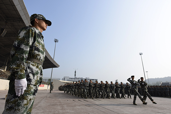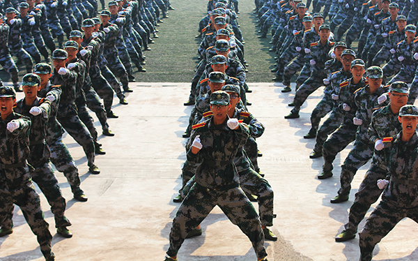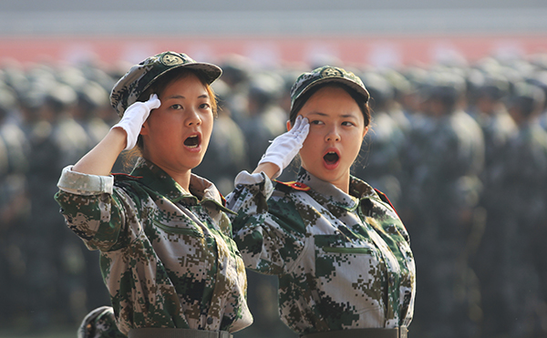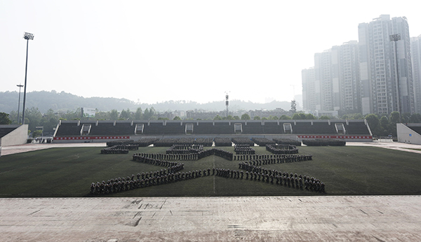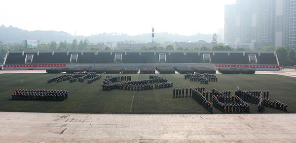 在莊嚴的升國旗儀式后,學生軍訓成果展示正式開始。各方隊喊著嘹亮的口號,邁著矯健整齊的步伐,依次通過主席臺,接受檢閱。他們昂首闊步,精神飽滿,意氣風發,盡顯重師學子昂揚向上的風貌。在捕俘拳表演中,“男兵”們出拳虎虎生威,踢腿凌厲有力,似雄壯有力的猛虎,精彩的表演贏得了全場熱烈的掌聲。女子表演方隊巾幗不讓須眉,她們用熱血之心展現出鏗鏘玫瑰的颯爽英姿。她們從不同方向有序匯集,擺出黨徽、五角星和“兩學一做”、“CQSD”的圖案、字樣,隊形設計獨具匠心。