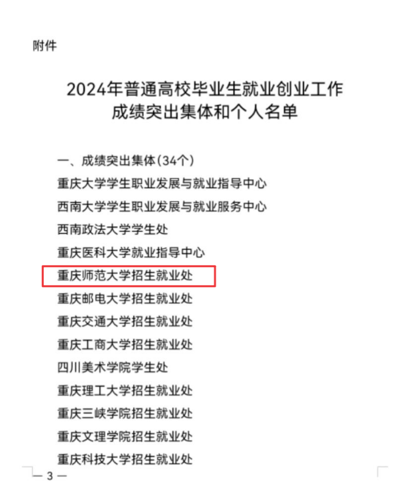 近日,我校招生就業處獲評“重慶市2024年普通高校畢業生就業創業工作成績突出集體”,招生就業處副處長王睿獲評“重慶市2024年普通高校畢業生就業創業工作成績突出個人”。