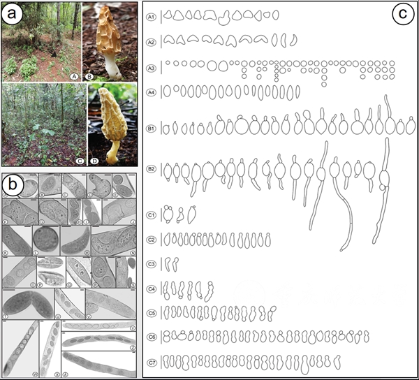 圖1a:秋天羊肚菌(Morchella galilaea); 圖1b:秋天羊肚菌不同形態的子囊孢子;圖1c:同等比例尺下秋天羊肚菌不同形態的孢子和不同孢子萌芽方式的示意圖。