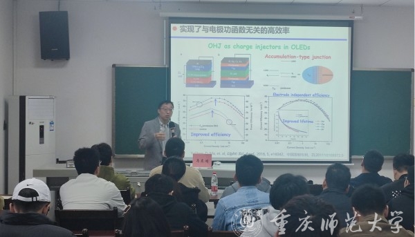 講座中,馬東閣教授主要介紹了其團隊圍繞有機光電器件與物理開展基礎和應用研究取得的相關成果,包括在有機發光二極管(OLEDs)、有機光電探測器(OPDs)、有機半導體激光(OSLs)等方面取得的一系列創新性成果。例如,有機半導體異質結大電荷注入技術、高效率白光OLEDs的激子限制結構、熱激子調控與高效率藍光熒光OLEDs、AIE藍光熱激子材料與OLEDs等相關理論。