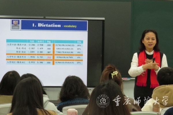 陳樺教授分享了三種不同的教學活動形式(聽寫、配音及反饋式演講)對學生語言學習過程和學習效果的影響。在聽寫方面,學生能學會擁有從聽到寫的能力,寫的能力不僅包括寫作,還包括用英語思維去思考、看待問題。不同困難程度的詞匯聽寫和篇章聽寫都對學生有著積極作用,“復雜式單詞聽寫”使學生的詞匯成績有顯著提高,而“篇章聽寫”對學生的口語水平有顯著幫助。“配音任務”有著鍛煉學生英語發音、語調等多方面的功能,并能夠提高學生的韻律表達能力。“反饋式演講”使學生從聽、看層面的能力轉換為說的能力,運用詞匯、語音、內容等進行綜合表達,提高學生的語言綜合能力。