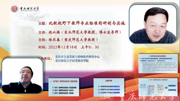 12月18日上午,東北師范大學國際與比較教育研究所所長、博士生導師、中國教育學會比較教育分會副理事長、《外國教育研究》雜志主編饒從滿教授應邀為我校師生作題為“比較視野下教師專業標準的研制與實施”的線上學術講座。講座由重慶市重點人文社科基地重慶市兒童發展與教師教育研究中心主任林長春教授主持。
