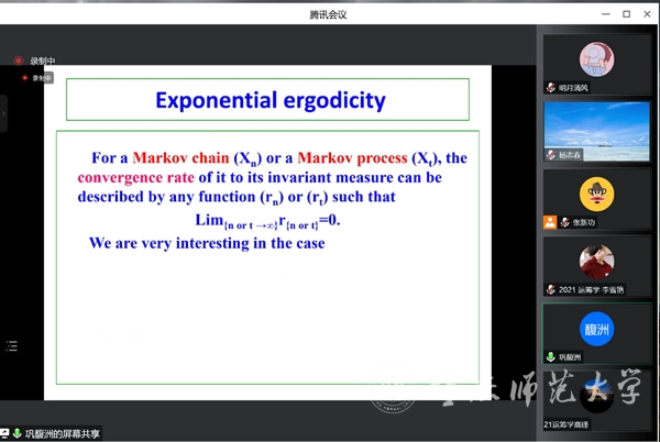 9月26日晚,中國(guó)科學(xué)院數(shù)學(xué)與系統(tǒng)科學(xué)研究院研究員鞏馥洲教授應(yīng)邀為數(shù)學(xué)科學(xué)學(xué)院師生作了一場(chǎng)題為“馬爾可夫過(guò)程遍歷性及判定的現(xiàn)代應(yīng)用”的學(xué)術(shù)報(bào)告。報(bào)告由數(shù)學(xué)科學(xué)學(xué)院院長(zhǎng)楊志春主持,以線上的形式開(kāi)展,數(shù)學(xué)科學(xué)學(xué)院運(yùn)籌學(xué)、應(yīng)用數(shù)學(xué),概率論與數(shù)理統(tǒng)計(jì)、系統(tǒng)科學(xué)等方向的教師及研究生參加。