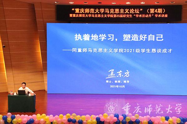 為培養(yǎng)學(xué)生的自主學(xué)習(xí)能力,拓寬學(xué)生視野、促進師生深度交流,2021年10月14日下午,馬克思主義學(xué)院于校友會堂音樂廳舉辦了重慶師范大學(xué)馬克思主義論壇(第4期)暨重慶師范大學(xué)馬克思主義學(xué)院第25屆研究生學(xué)術(shù)活動月學(xué)術(shù)講座。本次講座由重慶師范大學(xué)校長兼馬克思主義學(xué)院院長孟東方教授主講,主題為“執(zhí)著地學(xué)習(xí),塑造好自己——同重師馬克思主義學(xué)院2021級學(xué)生懇談成才”。馬克思主義學(xué)院政教系副主任、碩士生導(dǎo)師田方林教授擔(dān)任主持人,馬克思主義學(xué)院2021級本科生和研究生聽取了此次講座。