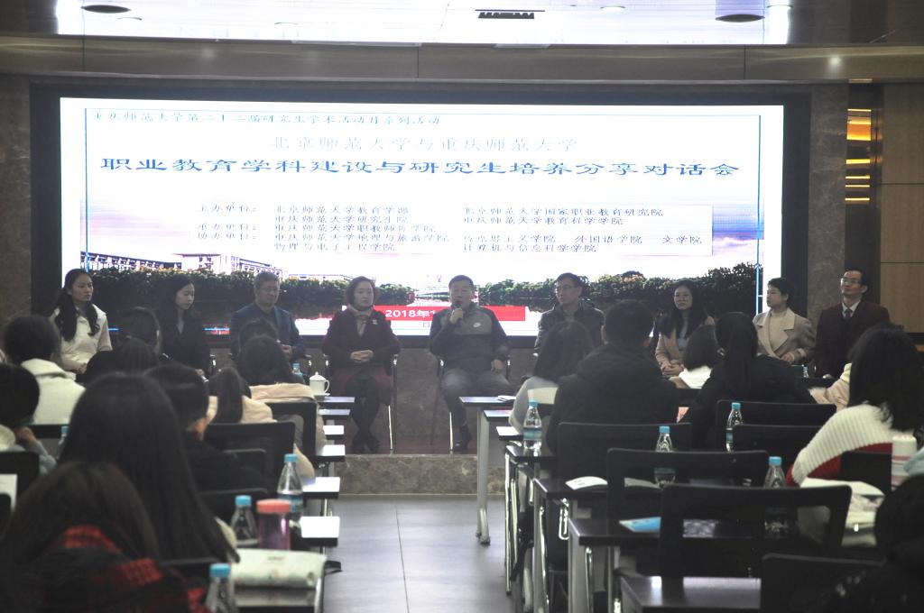 我校職教師資學院副院長南海教授匯報了我校職業(yè)教育學科建設發(fā)展的歷程以及職業(yè)教育研究生培養(yǎng)的情況。接著,兩校學生代表就考研、學習、生活、教育科研等方面的經(jīng)驗進行了交流分享。職教學院兼職導師、重慶城市管理職業(yè)學院國際交流處處長呂紅等導師做了精彩分享和指導。