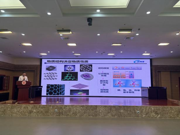 王芳衛研究員深入細致地介紹了我國首臺脈沖型散裂中子源—中國散裂中子源(CSNS),重點講解了中子散射技術及其在凝聚態物質研究中的應用,特別是在量子和無序材料、有機材料、原子動力學研究,以及無序、摻雜、相變、熱動力學、化學和生物性質等領域的應用前景。他和與會師生探討了中子散射技術在新型清潔能源材料(例如鋰離子電池材料、熱電材料等)方面的應用潛力。