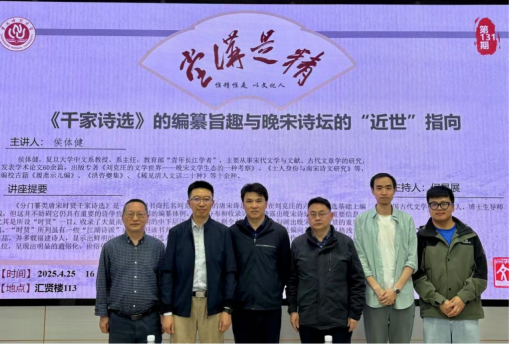 4月25日下午,文學院“精是講堂”第131期在匯賢樓113報告廳開講。復旦大學博士生導師侯體健教授受邀作題為《〈千家詩選〉的編纂宗旨與晚宋詩壇的“近世”指向》的專題講座。講座由中國古代文學學科負責人何易展教授主持。