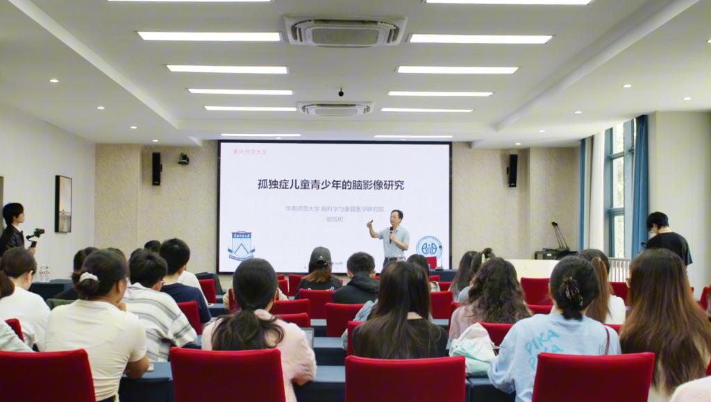講座中,翁旭初教授圍繞“孤獨癥兒童青少年的腦影像研究”主題,深入介紹了團隊近年來在靜息態功能磁共振成像(fMRI)技術應用方面的研究進展,分享了孤獨癥譜系障礙兒童腦網絡連接模式的最新發現,并結合具體案例闡述了腦功能異常與行為表現之間的關系。