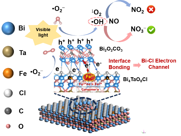氮氧化物(NOx)是大氣污染的“元兇”之一,其中一氧化氮(NO)的凈化一直是環保領域的難題。傳統技術難以實現高效且選擇性地將NO轉化,還容易在凈化過程中產生毒性更強的二氧化氮(NO?),進一步加劇空氣污染,危害人體健康。我校化學學院的科研團隊成功研發出一種新型復合光催化劑Bi4TaO8Cl/Bi2O2CO3-Fe。他們巧妙地構建了異質結,并引入Fe3?作為電子受體中心,為解決NO凈化難題提供了創新方案。該研究發現,Fe3?在光催化過程中具有“雙重身份”。一方面,它能夠增強界面電子轉移,讓光生載流子的分離效率大幅提升;另一方面,Fe3?可以激活表面位點的H?O,促使具有強氧化性的羥基自由基(?OH)生成。并且,優化后的異質結光催化劑,NO轉化率高達68.19%,而NO?選擇性卻低至10.98%,能有效抑制NO?的產生,將NO高效轉化為穩定的硝酸鹽(NO??)。電子自旋共振(ESR)和活性氧物種(ROS)猝滅實驗表明,Fe3?驅動的電子遷移使表面空穴富集,H?O吸附量增加,?OH生成量提升了2.76倍。強大的氧化能力使得?OH在光催化NO氧化過程中,能夠有效抑制NO?的生成,推動NO完全氧化為NO??。這項研究成果為選擇性去除NO提供了新的策略,為設計環保型光催化劑提供了關鍵思路,在大氣污染治理領域具有廣闊的應用前景。未來,隨著該技術的進一步發展和應用,有望為改善空氣質量、打贏藍天保衛戰貢獻重要力量。