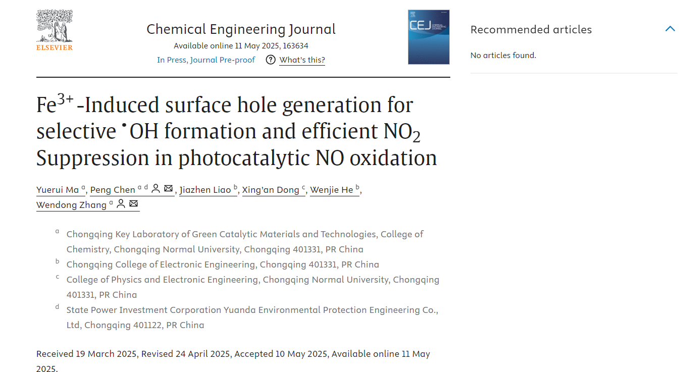近日,我校化學學院科研團隊在國際高水平期刊《Chemical Engineering Journal》(SCI一區TOP,IF=13.4)在線發表了題為“Fe3+-Induced Surface Hole Generation for Selective?OH Formation and Efficient NO2Suppression in Photocatalytic NO Oxidation”的研究論文,化學學院碩士研究生馬悅芮為第一作者、陳鵬副教授和張文東研究員為通訊作者。
