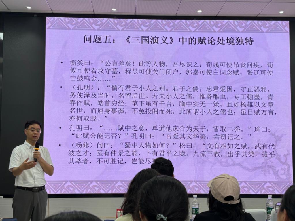 5月22日下午,“精是講堂”第137期在匯賢樓113報告廳舉行。本期講座邀請澳門大學中國語言文學系副教授、博士生導師、中國賦學會副會長王思豪擔任主講嘉賓,以《銅雀臺·斷橋·一場大霧——〈三國演義〉中的賦學之謎》為題。講座由文學院教授王于飛主持。