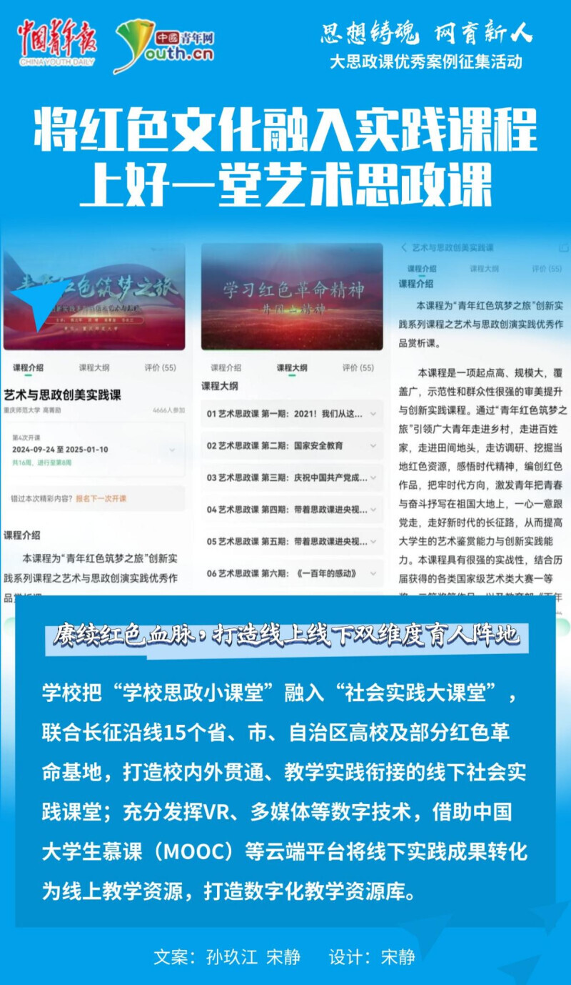 中國青年網北京4月14日電(記者 宋靜)近年來,重慶師范大學以重慶市紅色資源為載體,帶領學生身臨紅色革命教育基地,創(chuàng)作紅色民謠,打造紅色思政課程,將“學校思政小課堂”融入“社會實踐大課堂”,引導廣大師生深入社會實踐,挖掘當地紅色文化資源,將紅色文化貫穿到思政教育的全過程、各環(huán)節(jié),讓紅色文化資源煥發(fā)新活力、創(chuàng)造新價值、賦予新意蘊。
