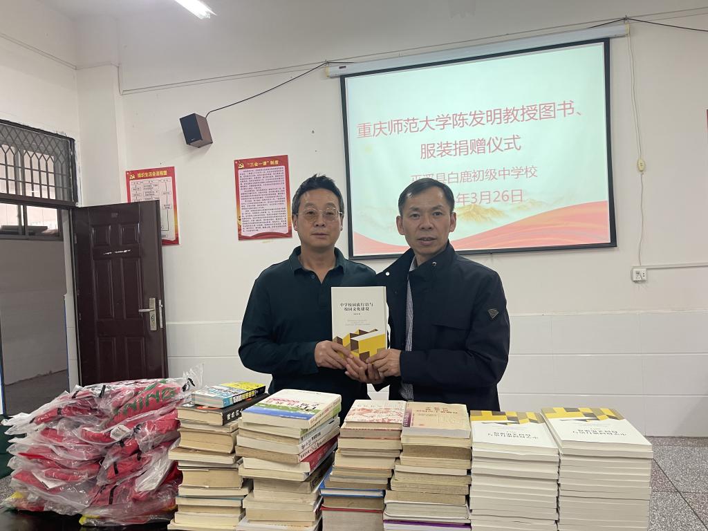 2024年4月,陳發明為白鹿中學捐贈專著《中學校園流行語與校園文化建設》200本。12月重慶師范大學文學院稅強書記、凌孟華院長一行前往徐家鎮岔路村慰問陳發明書記,深入了解農村教育及發展現狀,并為當地學校白鹿中學和徐家小學捐贈物資,以實際行動支持鄉村振興事業。