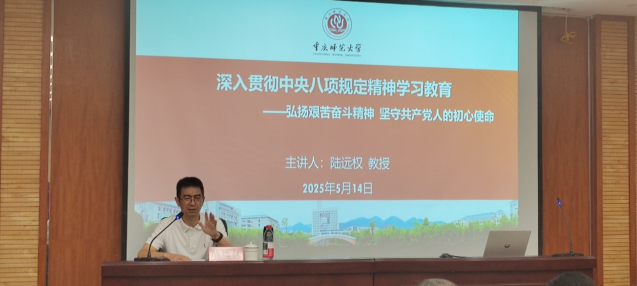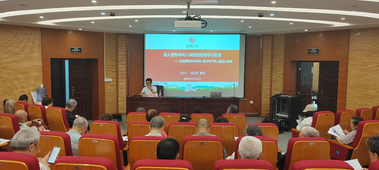 為進(jìn)一步推動(dòng)深入貫徹中央八項(xiàng)規(guī)定精神學(xué)習(xí)教育走深走實(shí),幫助廣大離退休黨員更全面、深入理解中央八項(xiàng)規(guī)定精神內(nèi)涵,5月14日上午,學(xué)校離退休黨委在沙坪壩校區(qū)5201教室組織離退休各支部支委集體學(xué)習(xí)。學(xué)校副校級(jí)干部陸遠(yuǎn)權(quán)教授參加學(xué)習(xí),并以“弘揚(yáng)艱苦奮斗精神堅(jiān)守共產(chǎn)黨人的初心使命”為題,為大家講授專題黨課。離退休處黨委書記劉艷主持會(huì)議。